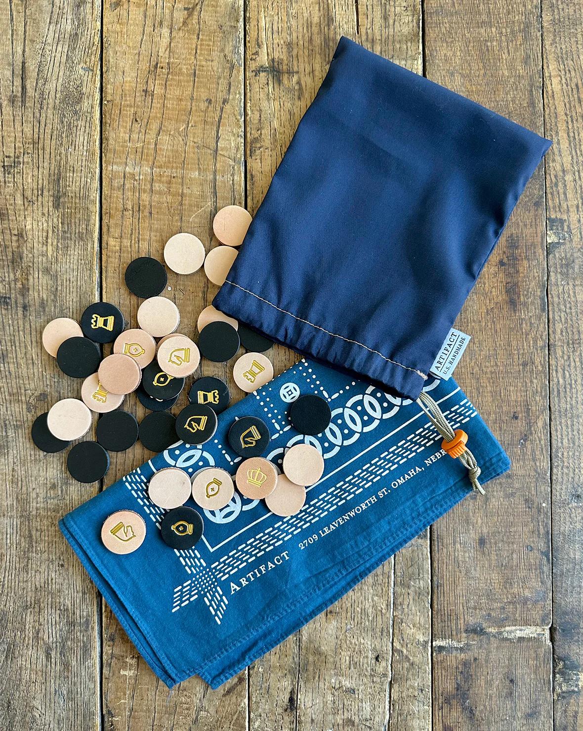 Compact portable travel chess & checker set w/ 100% cotton bandana game board, full grain leather game pieces, and handmade drawcord pouch. Made in USA.