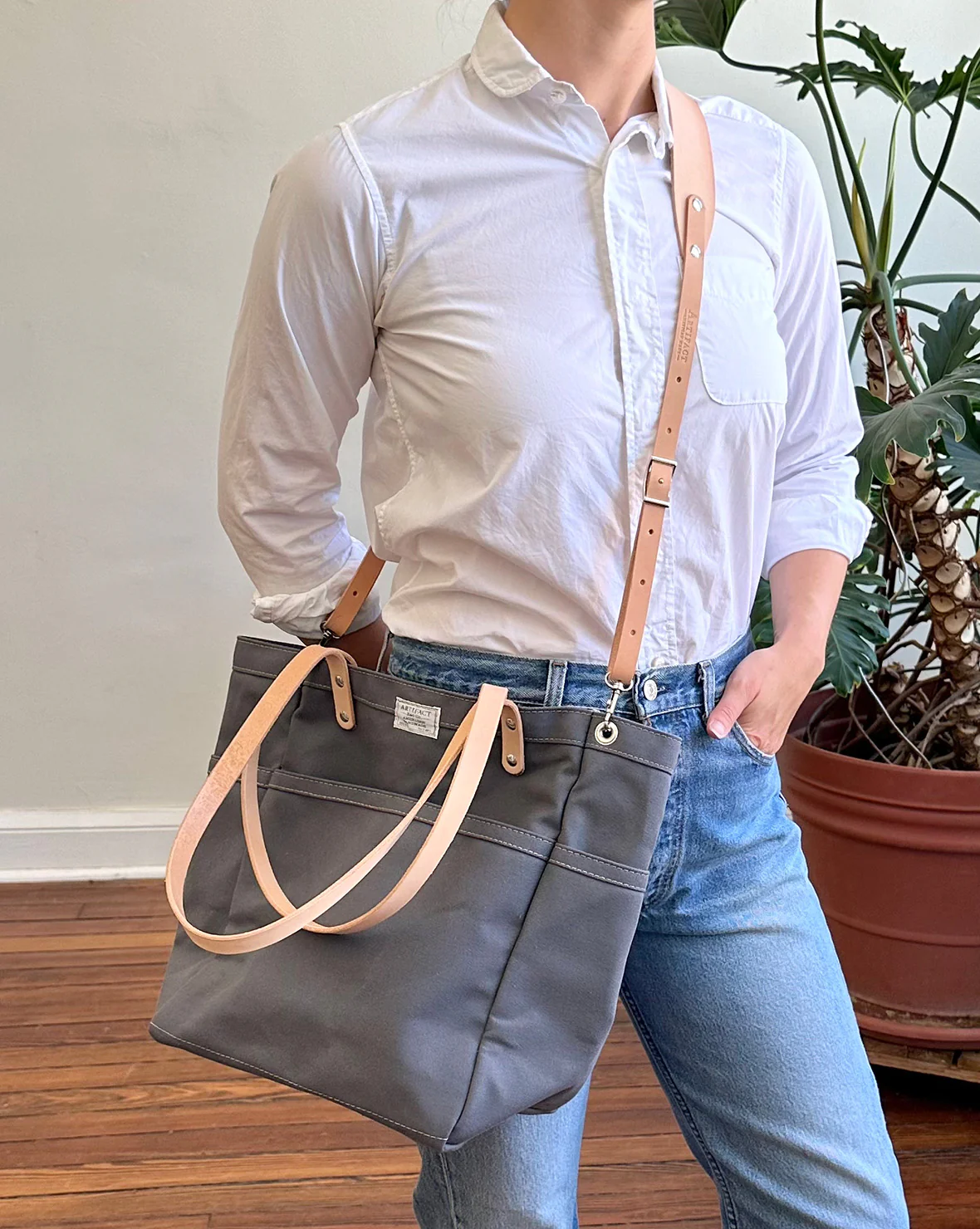 This versatile, fun tote is our best selling go-to for daily carry. Small batch handmade in our Omaha, NE studio using sturdy water repellent duck canvas and American full grain leather.