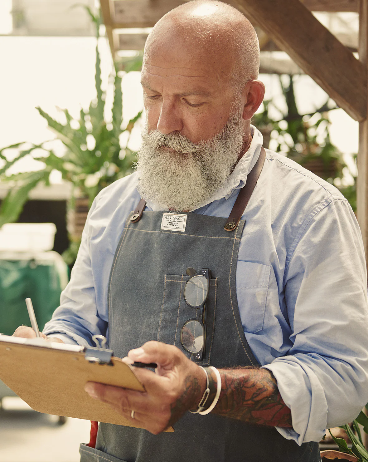The No.448 Garden & Gather Apron is made from durable waxed cotton to handle dirt, moisture, and abrasion. This updated version includes a snap system that transforms the lower apron into a large gathering pocket—ideal for harvesting produce, collecting flowers, or clearing weeds as you go.