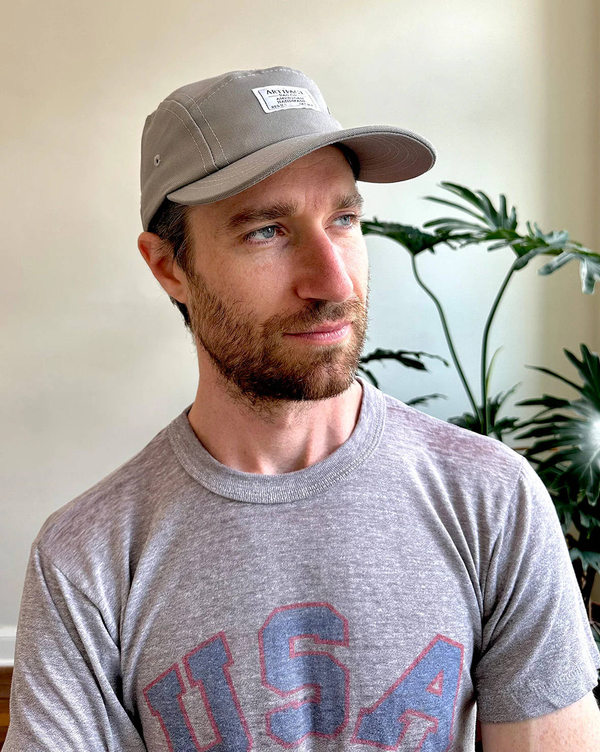 The 5-panel "camper" cap is preferred headgear in windy conditions due to its form fitting crown. Well suited for: fishing, hiking, boating, tennis, skating, running, cycling, and any activity where you are want to minimize having your cap whipped off your head! Made in USA from GOTS certified organic canvas.