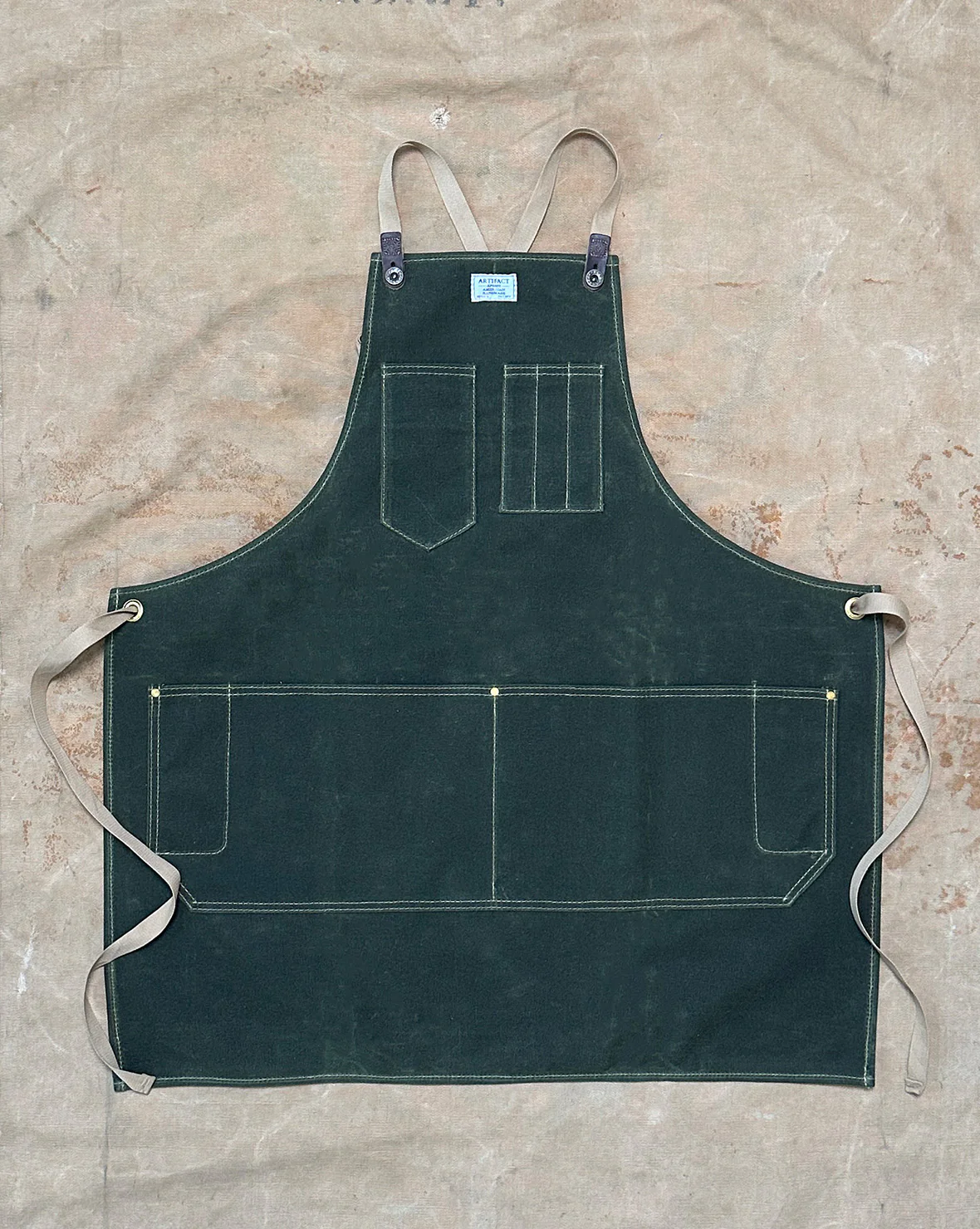 Our signature workshop apron—now improved with removable cross-back ties and enlarged waist grommets for easier strap adjustment and cleaning. Designed for long hours in the shop or studio, the cross-back design relieves neck strain and provides an adjustable, balanced fit. Handmade in Omaha, NE from durable waxed canvas, duck or Cone Mills denim.